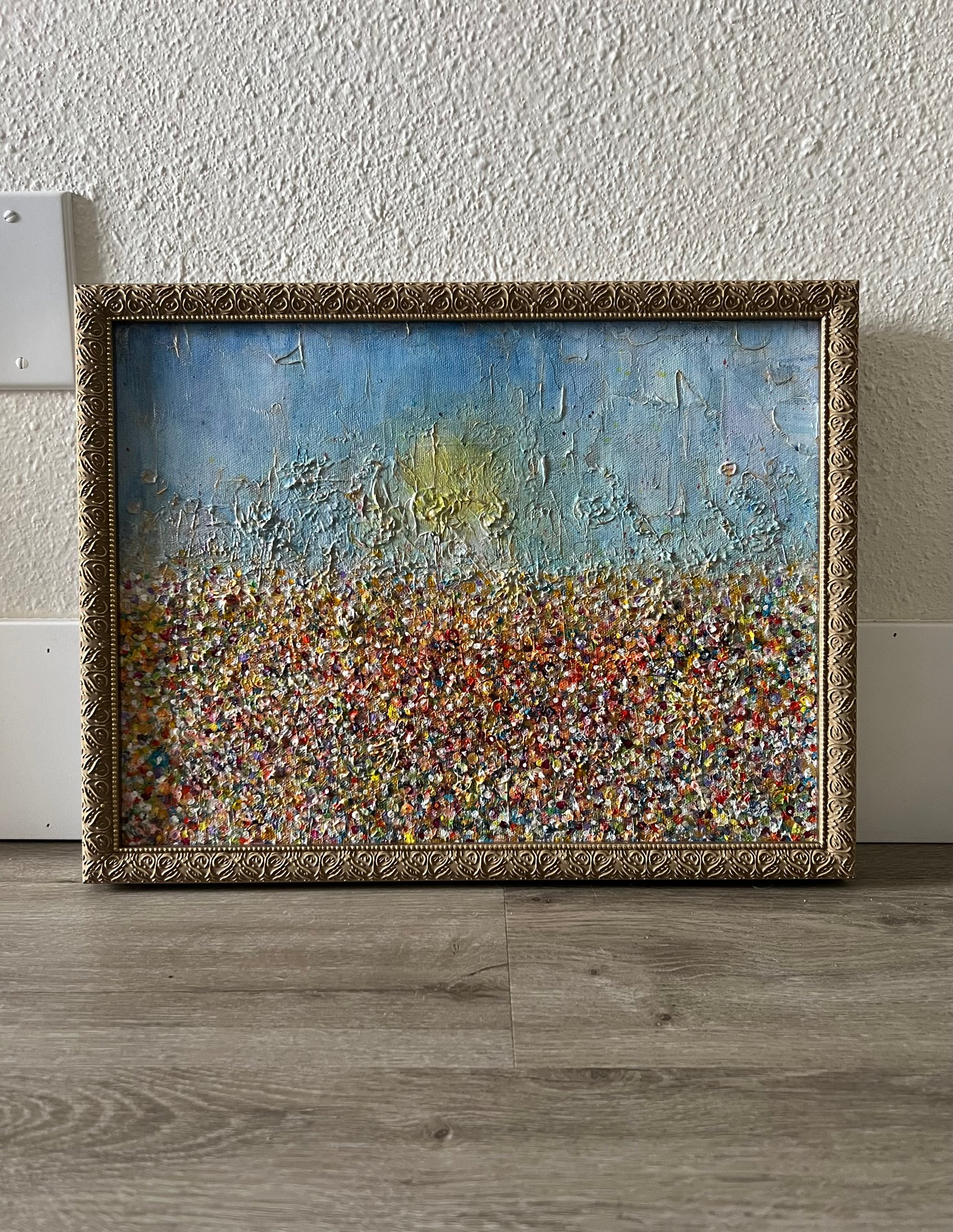 This is a signed, one of a kind painting on 3” deep stretched canvas, sealed with glossy varnish. Gold ornate frame and hanging wire included.