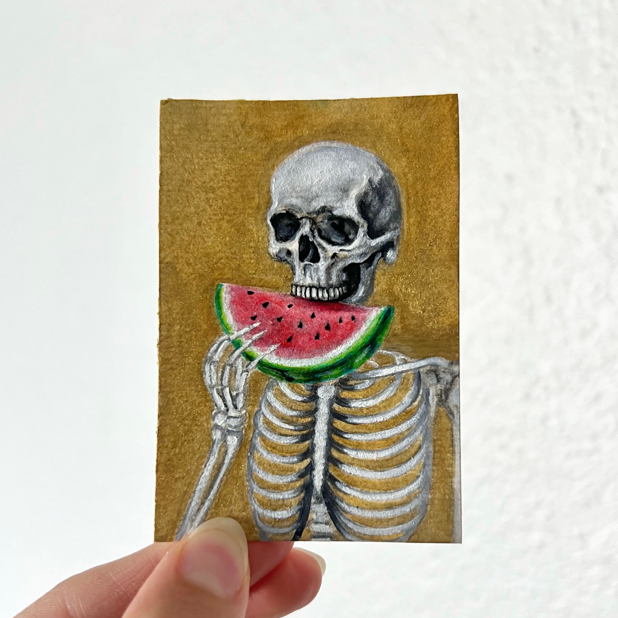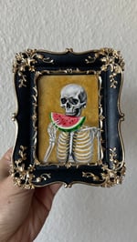 This is a signed, one of a kind painting in a 3.7” x 4.7” frame. Frame can stand or be mounted to wall.